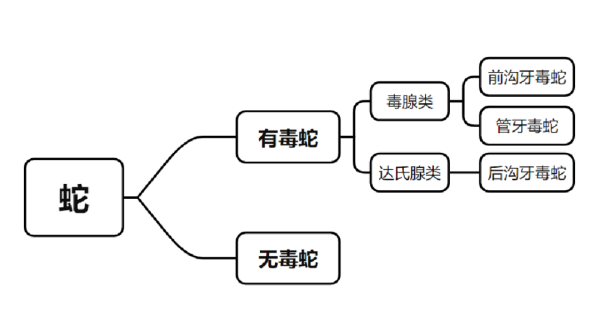 根据形态特征,毒蛇可以分为三大类:管牙类毒蛇、前沟牙毒蛇、后沟牙毒蛇。