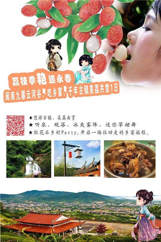 16:30 抵达岵山古镇:位于永春县城南部,是座拥有千年历史的典型闽南特色古镇。【慢行岵山千年古镇】古厝、古寨、古树、古街、古民俗汇聚传统村落,这就是茂霞。导游线路(游程1.5小时):岵山旅游接待中心——茂霞村——福茂寨——熟地园——荔枝树王——荔枝河岸(备注:不含荔枝品尝,荔枝园请自由选购荔枝15元/斤带走)