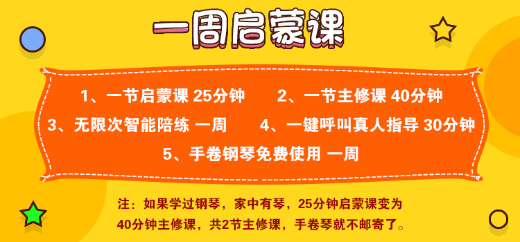 注:如果学过钢琴,家中有琴,25分钟启蒙课变为40分钟主修课,共2节主修课,手卷琴就不邮寄了。