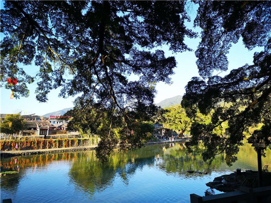 2、随后漫步“云水谣古栈道”,这里是电影《云水谣》的取景地之一, 那幽长的古道、百年老榕树、还有那灵山碧水无不给人们以超然的感觉,怀远坐在老榕树下,听溪流潺潺,沐乡风徐徐,看淳朴民间的乡民走过,一种亲近乡土、回归自然的感觉油然而生。
