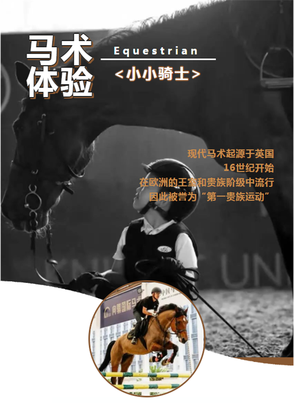 马术是一项优雅又有趣的运动。小朋友们将在教练的指导下学习穿戴装备,在教练的陪伴下攀上马背,规范骑乘姿势,尝试一些简单的骑乘动作。小朋友们将在起伏的马背上,体验骑乘乐趣,收获自信。
