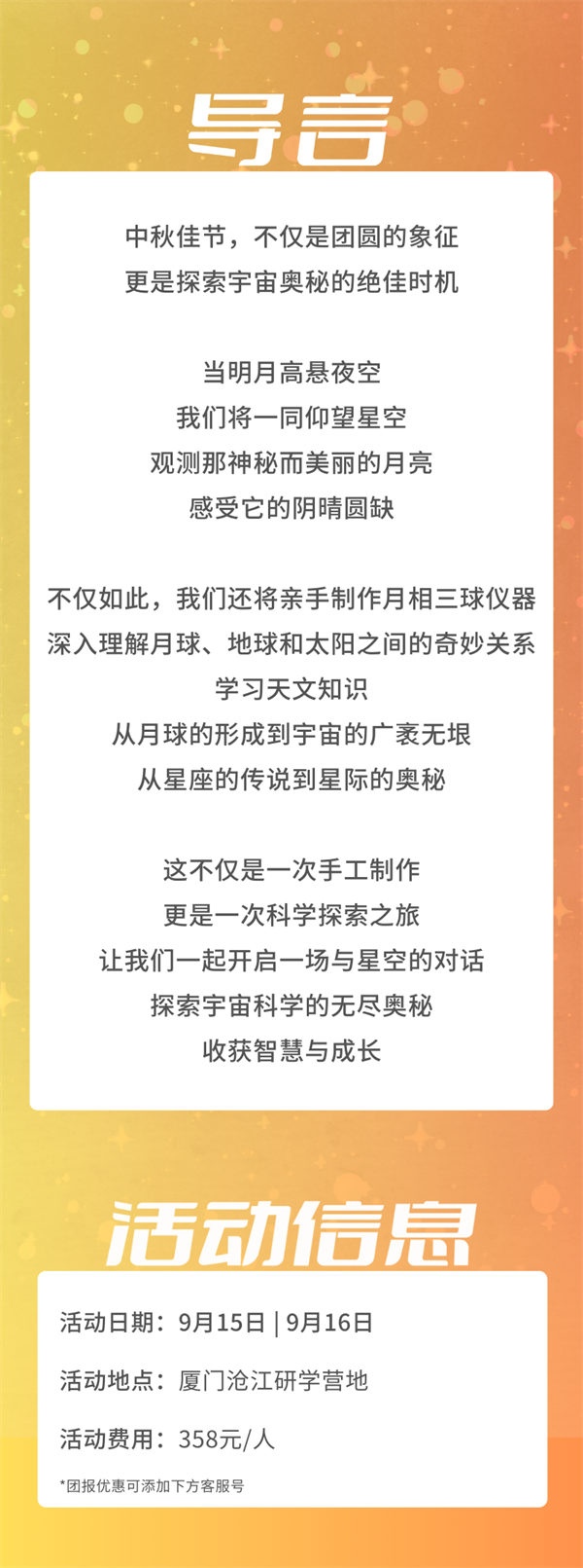 1.如由于报名人数不足无法成行,我们会至少提前10天通知家长,您可选择全额退款或择期参与其他活动。