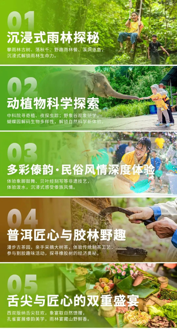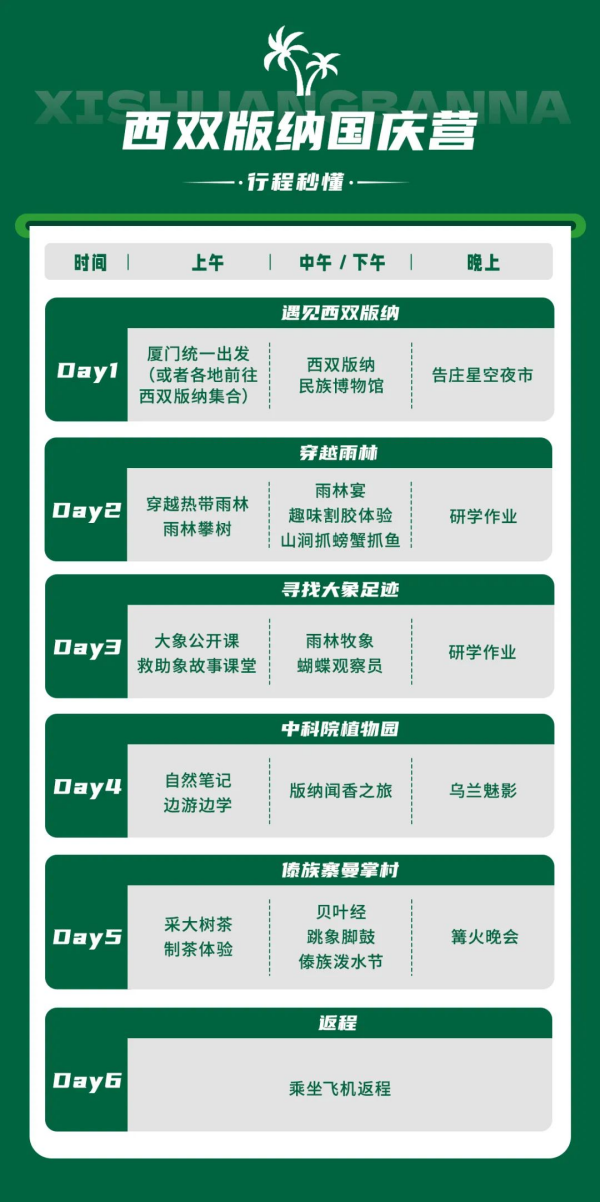 上午:【穿越热带雨林】徒步原始雨林,调动五感感受雨林生态环境,野外探索,锻炼野外生存能力,践行环保理念:无痕山林、雨林生态保护。