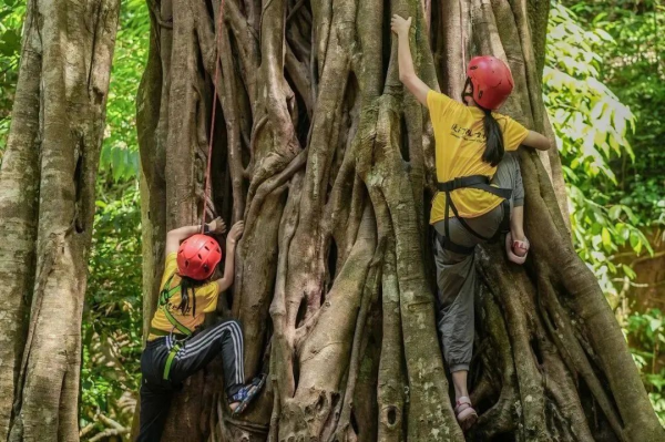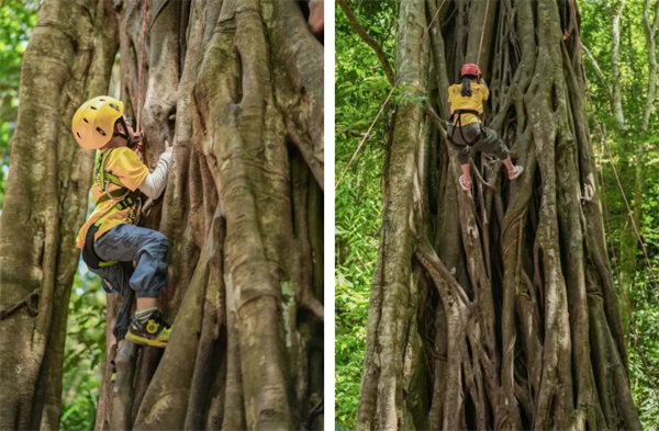 穿戴好装备,在安全员、安全绳索的保护下,攀爬高达20米的榕树,你准备好了吗?一起战胜自我内心的恐惧,去丈量榕树的高大。