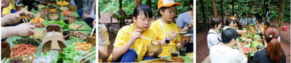 越过沟壑,进入雨林中,一桌子雨林餐等着享用,雨林大餐不仅环境很野,食材很野,烹饪的方式也很野,竹筒饭、包烧红尾巴鱼、包烧肉看得人垂涎三尺。