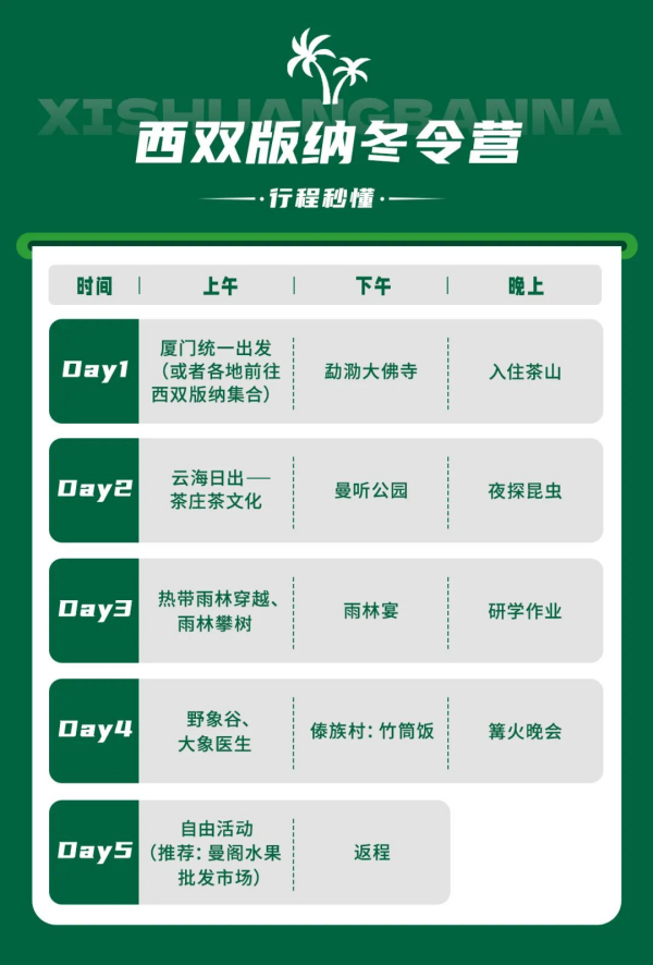 上午:厦门统一出发(或者各地前往西双版纳集合)