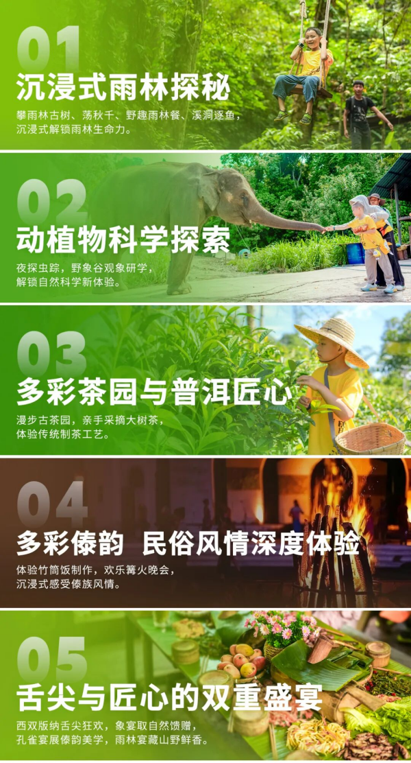 4、活动体验:大象医生、西双版纳热带雨林向导费+保险、云海日出、茶文化课程、傣寨文化课程、篝火晚会、夜探昆虫;