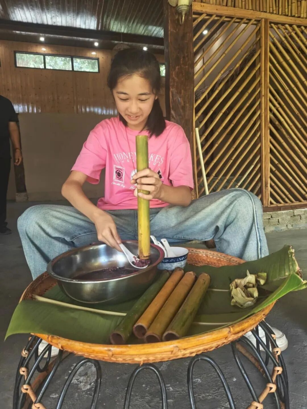 下午:【傣味竹筒饭】亲手制作传统竹筒饭,在村寨的炊烟袅袅中,家长与孩子一同化身为傣家小厨手,学习砍竹、装米、调味与火烤的全过程,品尝自己亲手制作的清香软糯竹筒饭。