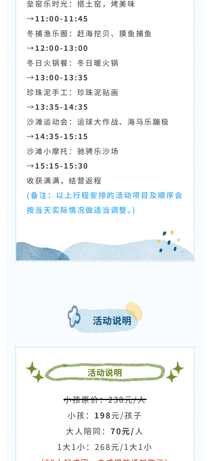 1.遇特殊情况如天气或场地等原因,根据实际情况有权对行程项目内容进行调整,若有减少项目不予退费。如遇天气等不可抗力因素,有权延期或取消活动,以实际通知为准。