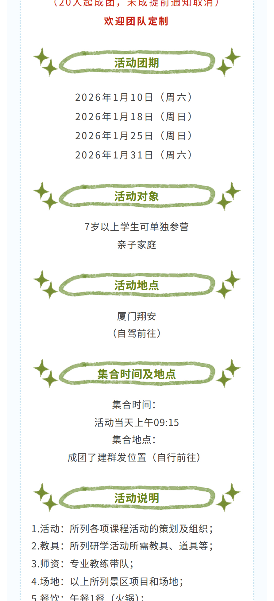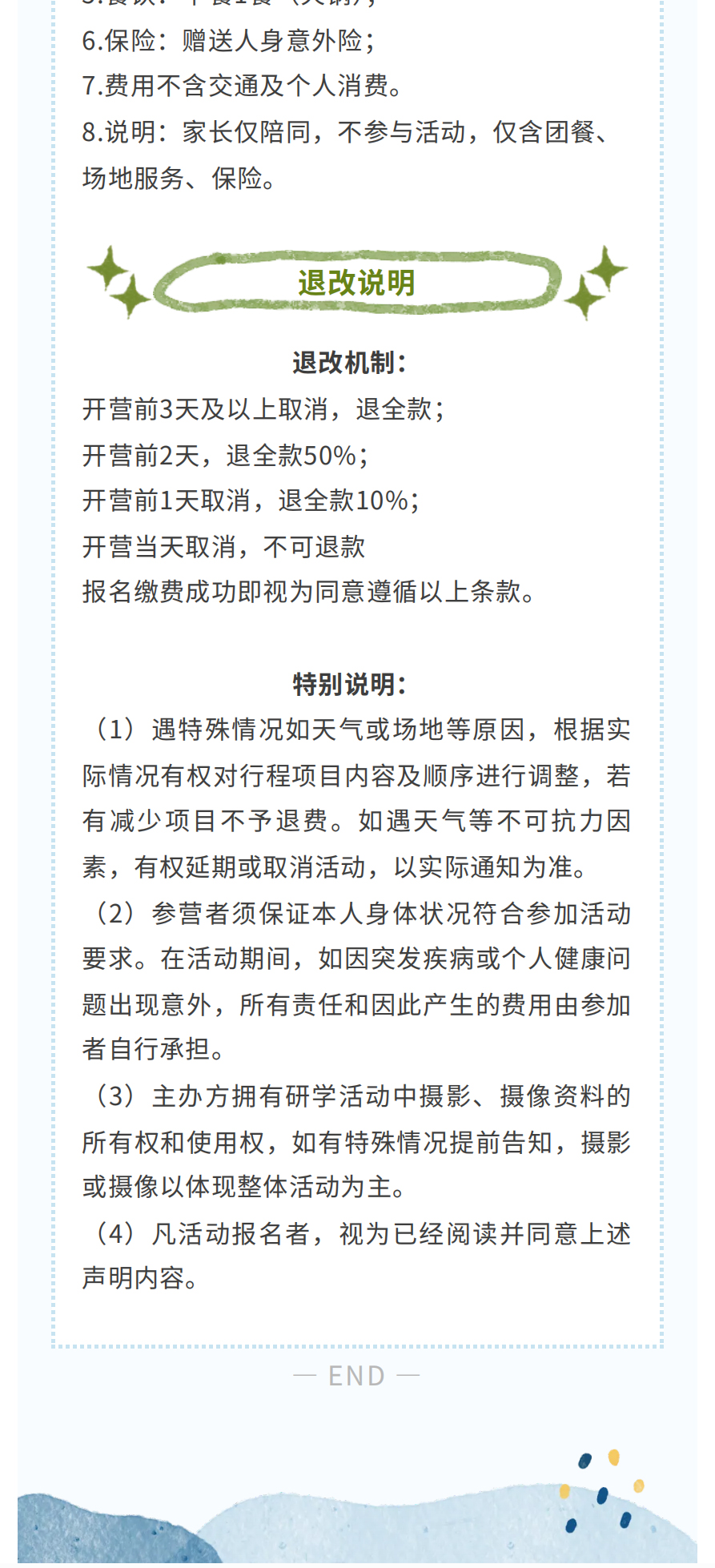 8.说明:家长仅陪同,不参与活动,仅含团餐、场地服务、保险。
