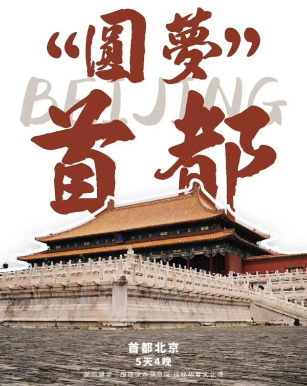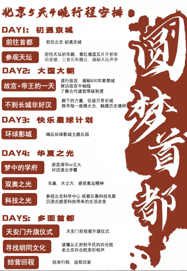 五天,圆梦首都计划,六大游学主题激发国家自豪感,十大体验全方位感受祖国崛起巨变。从老北京到大中国,用双脚双眼和一颗好奇心探访帝都,将中国古今文化尽收眼底。以“博物馆寻宝—沉浸式体验—非遗文化传承”的组合探究方式建立对首都的认知,让眼界突破课本,让知识更加深刻。