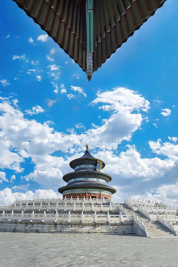 天坛,天圆地方体态雄伟,构架精巧,端庄、稳重,红墙蓝瓦色彩对比强烈,又不失协调得体,步入内坛如踏祥云登临天界。