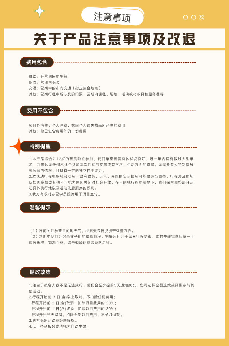 1、如由于报名人数不足无法成行,我们会至少提前5天通知家长,您可选择全额退款或择期参与其他活动。