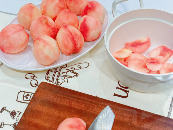 挑选较生的桃子或者硬桃。将桃子洗净去皮去核切成四瓣或对瓣备用!