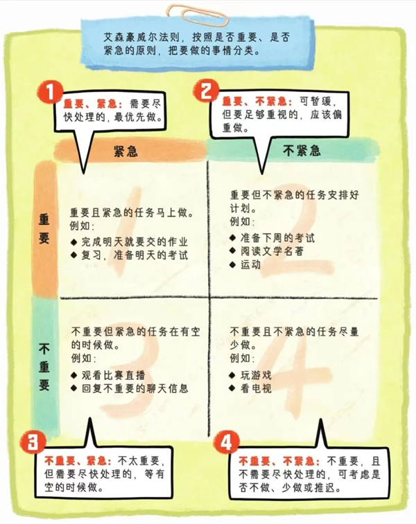 《高效能人士的七个习惯》作者史蒂芬·柯维 受美国第34任总统德怀特·艾森豪威尔的启发,创造了“艾森豪威尔决策矩阵”,这个矩阵能帮助你根据“紧急程度”和“重要程度”给事务分类,弄清生活和工作中各项活动的优先级。